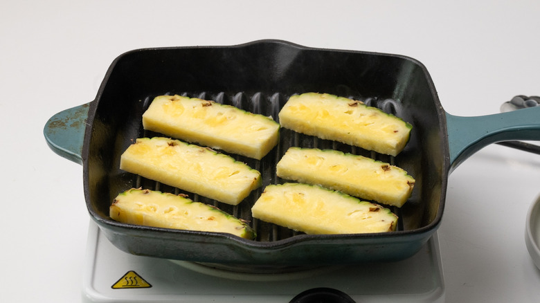 - Place the slices of pineapple on the heat and cook for 3 to 4 minutes, until well charred.