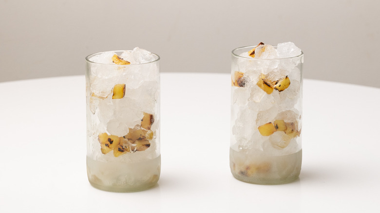 Fill 2 glasses with ice and the remaining diced grilled pineapple.