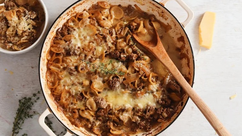 The name of this dish is a bit of a mouthful, but so is the food itself. This is a great option for when you're looking to indulge in a hearty beef dish, but want more flavors than just beef alone. This recipe developed by Leah Maroney of Mini Pie Kitchen loads the onions on thick, fleshes out the sauce with white wine and heavy cream, and gives it a chef's kiss with some Gruyère cheese. Before you start clutching at your wallet like a string of pearls, Gruyère cheese is surprisingly affordable compared to most premium cheeses.