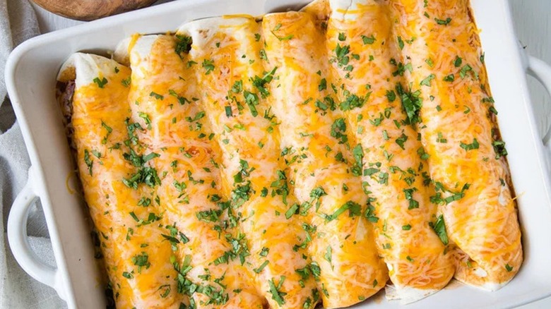 Enchiladas deserve a star on Hollywood Boulevard. There are few recipes so well loved as good old enchiladas. This recipe developed by Kate Shungu of Gift of Hospitality plays it straight with ground beef, green chiles, and onions cooked up and thrown into the tortillas alongside a nice sour cream and salsa sauce. Roll up the tortilla and top it with cheese before baking it in the oven and you've got yourself a new family favorite. Enchiladas are also an easy dish to upgrade with just a few additional ingredients if you want to add something special.