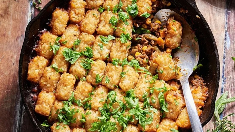 Irish pies rank high on the list of ground beef casseroles, but that kind of popularity comes at a price – the recipes can get stale after a while. This tater tot hotdish recipe created by Michelle McGlinn took the shepherd's pie formula and flipped it on its head by subbing out the mashed potatoes for crunchy tater tots. It's the crispy and bold twist you didn't realize you needed, since shepherd's pie is typically creamy and soft. Why not try something new? You won't believe how quickly this dish comes together.