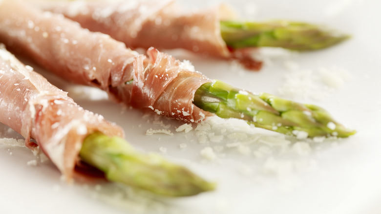 Veggie lovers know that there are tons of ways to make asparagus — all of them delicious. But there's one simple preparation method that takes it to a whole new level, and that's wrapping it in prosciutto. Prosciutto is a thinly sliced, Italian dry-cured ham, and its salty, sweet, and delicate flavor make it a perfect match for the earthy, slightly bitter asparagus. The saltiness of the prosciutto enhances the subtle bitterness of the vegetable, while its sweetness balances the earthiness. Together, the flavor is complex yet satisfying.