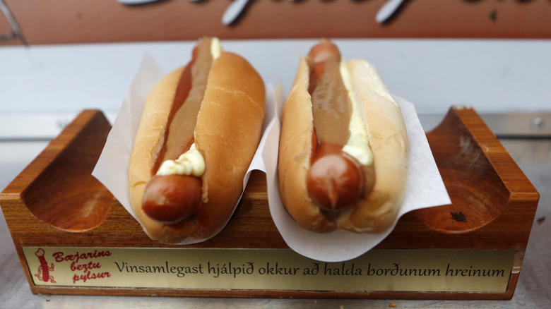 Icelandic hot dogs can be boiled or grilled just long enough to yield a toothy, juicy first bite. Some cooks will add beer to the vat in which hot dogs are boiled. For crispier dogs, frying and grilling makes for a crunchier snack. Should you be lucky enough to find yourself in Iceland, one stand has been passing out hot dogs since 1937. Bæjarins Beztu, which translates to The Best in Town, serves hot dogs rain or shine. Though the stand once doled out dogs topped with sauce made from skyr, if you order a hot dog with everything, you'll be passed a traditional lamb hot dog topped with Icelandic mustard, fried and raw onions, Remolaði sauce, and homemade ketchup made with apples. If you see a long line of customers, don't panic. Rumor has it that employees are rewarded for each hot dog sold, so expect lines to move quickly. Keep in mind that prices for hot dogs can vary, but plan on spending at least a few bucks for an Icelandic hot dog with all the fixings.