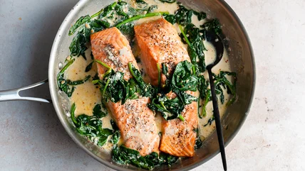 You may wonder if you can use a fish type with a stronger taste — maybe you don't care for white fish or you've already made it with white fish and want to switch it up. In Tasting Table's Florentine recipe, we use salmon — salmon is considered one of the fish varieties with the strongest taste — so the answer is yes. However, our recipe makes some adjustments to better suit the fish's strong taste — the sauce is simpler, with just heavy whipping cream, butter, garlic, red pepper flakes, and spinach. Without the cheese, the sauce becomes milder in taste while retaining the essential creaminess.