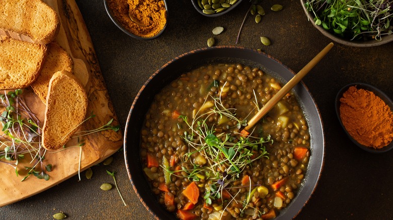 Although soup season only comes around once a year, we like to enjoy it in winter, spring, summer, and fall. The best part about soup is that you can pack it with ingredients. Soup can be made out of any fruit, vegetable, grain, or meat, so it's a great option for those of us with overflowing gardens or CSA memberships, and people who love a bulk deal at the grocery store. While lentils are typically reserved as a meat replacement in soup, we think the two can coexist in a very delicious way. Both vegan and meat-heavy soups can benefit from the fiber-packed little legumes in both flavor and nutrition.