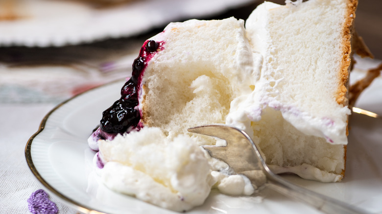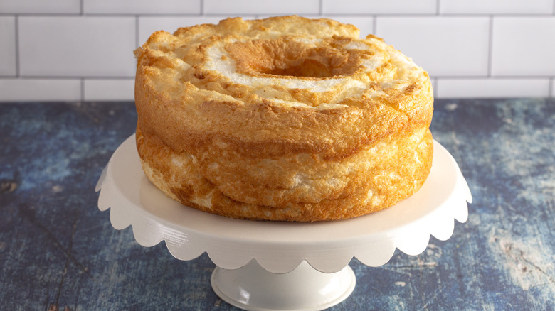No matter where you keep your angel food cake and for how long, you should know how to spot spoilage. Any smells that just seem off are your first indicator that it's time to toss that cake. Beyond that, you might even see mold pop up. As soon as you feel a bit of staleness, the dessert is likely past its prime since angel food cake is all about its heavenly texture.