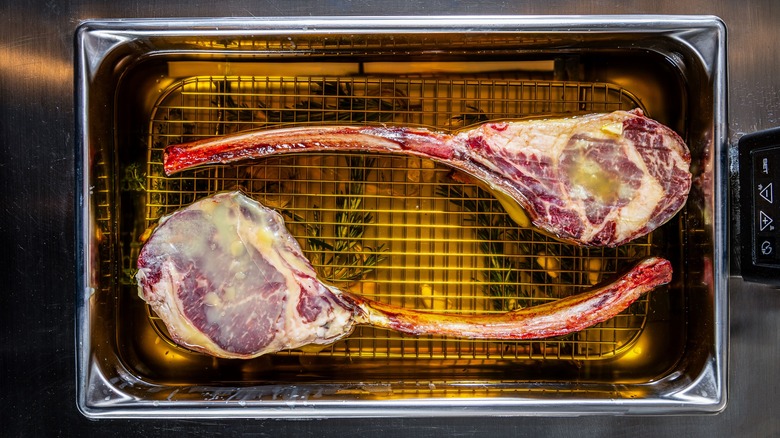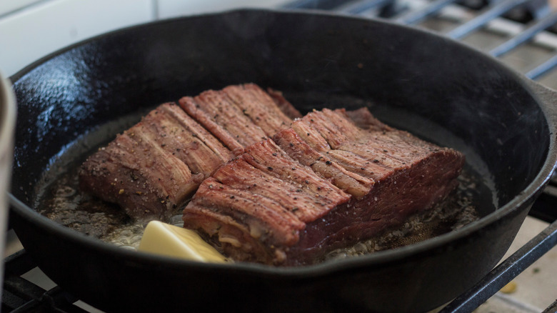 When it comes to finding the right fat to cook your steak in, you've got options. However, before you reach for that bottle of olive oil in your pantry, take a beat. To avoid a burnt, unevenly cooked steak with a bitter taste, avoid using any unrefined oils with a low smoke point, such as non-clarified butter which has a smoke point of 302 degrees Fahrenheit, or extra virgin olive oil, which has a smoke point of 325 degrees Fahrenheit. Using these types of fat on your searing hot pan or grill will turn that once beautiful steak into a bitter-tasting disaster.