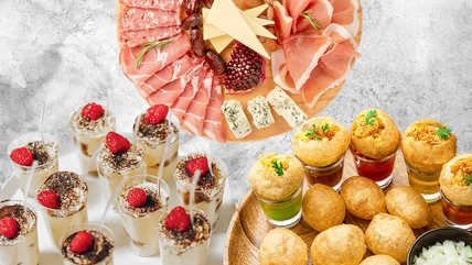 Petit fours fans will adore the concept of a shotcuterie party, as the recipes you put together are intended to be plated in small, individual servings. The shot-based theme is ideal for gatherings in which you want to encourage guests to help themselves, as the pre-portioned bites can be easily and cleanly picked up and served. You'll need plenty of shot glasses to make this kind of presentation happen, but even if your home bar is weak in the glasses department, you can use smaller containers, cups, and saucers to set onto trays and pack with treats. With prettily made glasses of food and drink presented for your guests, your party is in for a fun aesthetic upgrade.