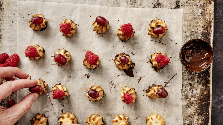 Just as you consider the flavors, colors, and textures of the ingredients you place onto a standard charcuterie board, consider which items will work best when set into individual containers. Use clear shot glasses to your advantage to layer ingredients and keep your recipes organized by lining up similar treats in rows. The kinds of snacks you'd collect for charcuterie snack boxes can easily come into play here: Carefully cubed pieces of cheese, chopped fruit topped with dollops of whipped cream, vegetable sticks and hummus, and delicate containers of layered cakes and puddings. You can use trays to separate sweet and savory bites.