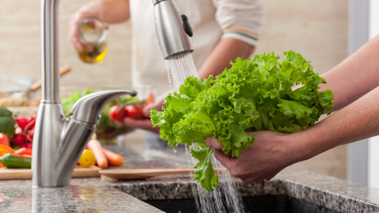 One trick to a safer salad at home is knowing the right way to wash your head of lettuce. Rinse the exterior of the lettuce under running water before cutting it up to remove any contaminants. Then, wash the cut or torn pieces to remove any particles or bugs that could be hiding inside. Other steps to keep your greens safe include properly refrigerating them to prevent any microbes that might be present from growing out of control, and always cleaning your knife and cutting board between tasks to prevent cross contamination. Growers are constantly improving their safety protocols, so don't avoid your greens — they're a great source of nutrients when you handle them safely.