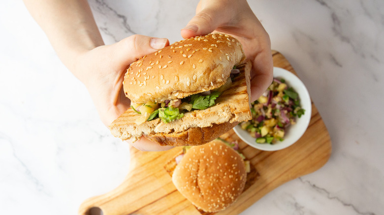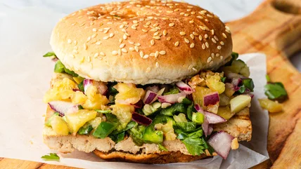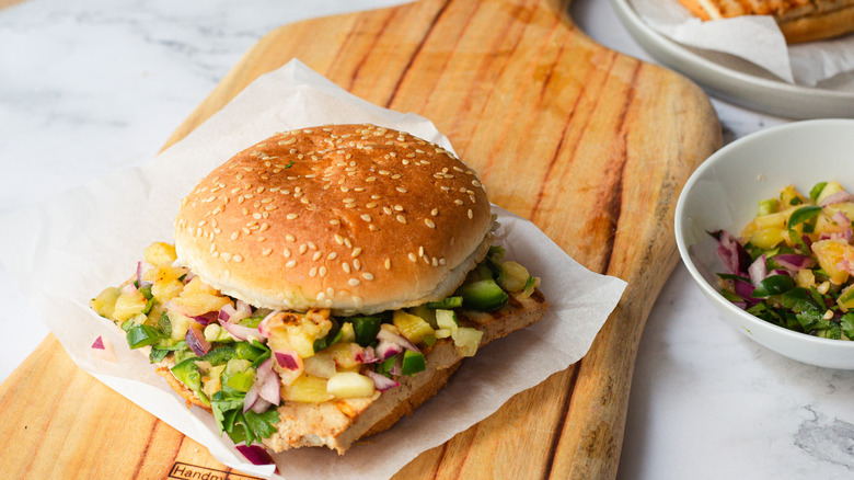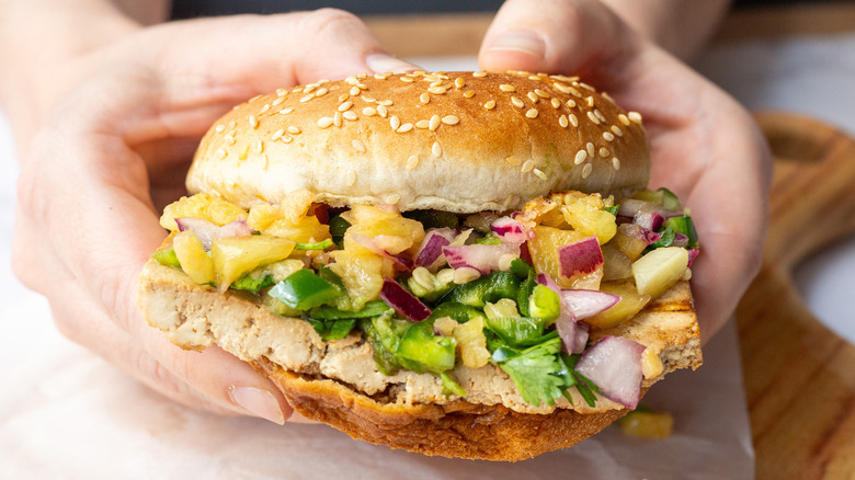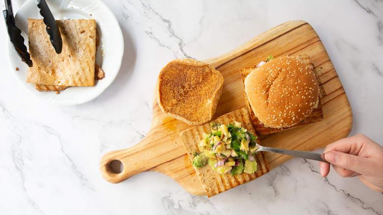 This tofu burger starts with the dominant flavors of the tropics and adds a bit of spice and the smoky touch of the grill pan to produce a grilled burger that delivers loads of flavor, texture, and color. According to Ksenia Prints of At the Immigrant's Table, the salsa on this burger builds on the traditional Cuban pairing of avocado, pineapple, and red onion, but takes it up a notch by adding some char to the pineapple with the help of a grill pan. The smoky, bright, tangy-sweet pineapple contrasts with the creamy avocado slices and lends the salsa a deep, nuanced flavor. This smokiness is further heightened by the umami flavor of the tofu marinade itself, which relies on soy sauce, rice vinegar, garlic, and ginger for its depth of flavor.