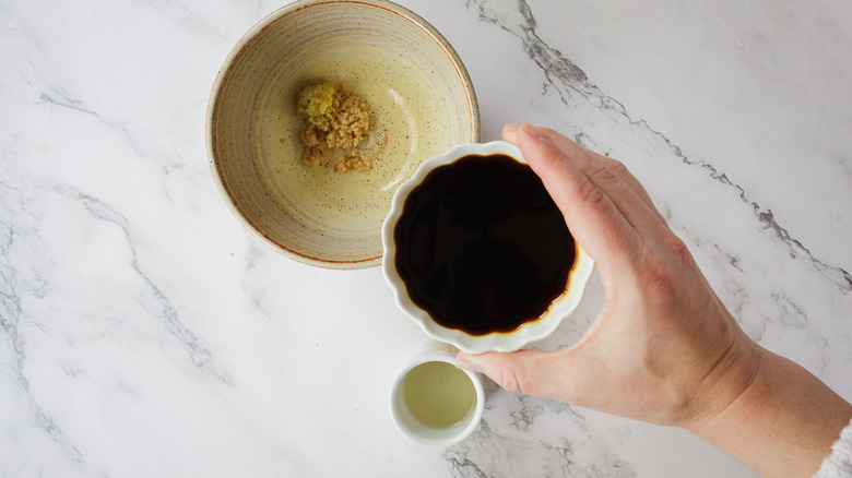 - In a small bowl, whisk together the soy sauce, vinegar, garlic, and ginger.