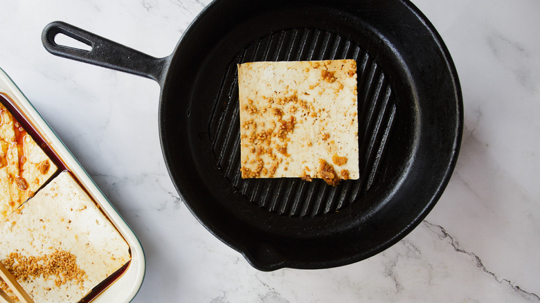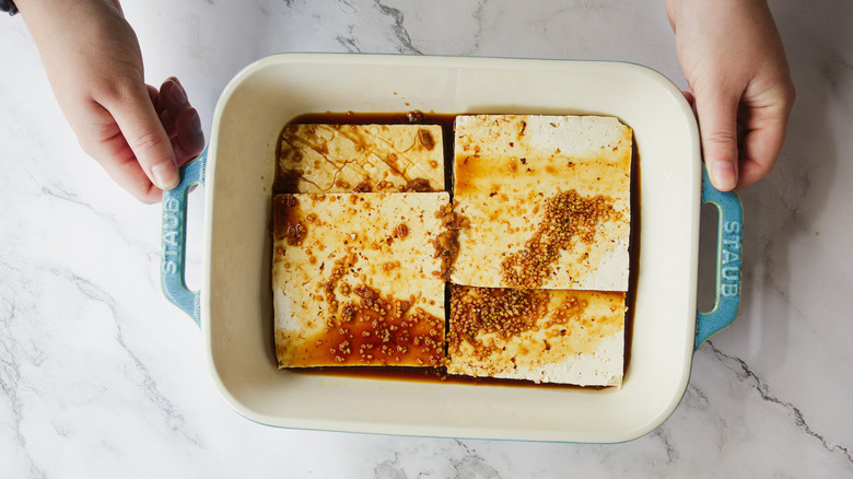 - Place tofu in a shallow dish and cover with marinade, turning to coat both sides. Marinate for at least 30 minutes, flipping once.