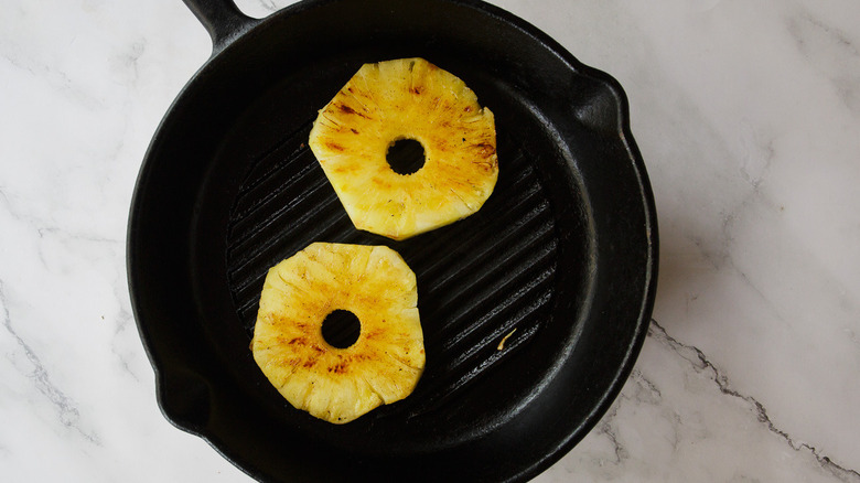 - Grill the pineapple slices until charred, about 2-3 minutes per side. Remove from heat and let cool slightly.