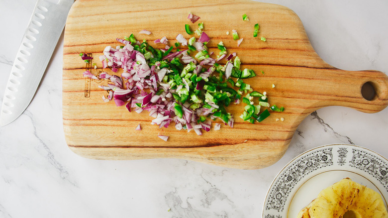- Dice the grilled pineapple and transfer it to a bowl with the diced onion, jalapeño, cilantro, and lime juice. Toss to combine. Set aside.