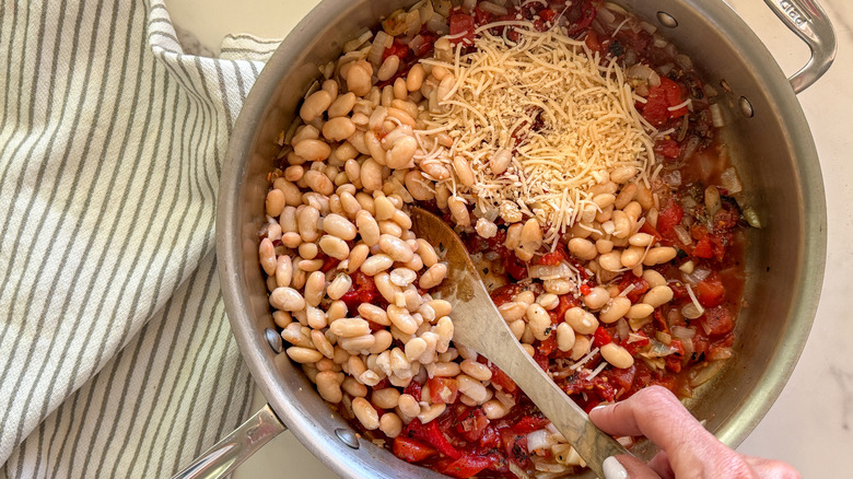 - Add the cannellini beans and Parmesan cheese, reduce heat to low, cover the skillet, and cook for 10 minutes.