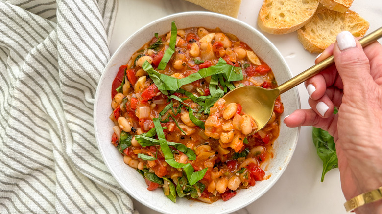 The addition of fire-roasted tomatoes and roasted red peppers have a smoky flavor which contrasts the tanginess of the sun-dried tomatoes and the sweetness of balsamic vinegar. Tender white beans offer a hearty base, and the fresh spinach boosts the nutritional value while adding a touch of vibrant color. As wellness coach and recipe developer Miriam Hahn tells us, "This delicious, savory skillet has become a favorite in my house. We love to serve it with toasted baguette or fresh sourdough bread for dipping. It's a winner every time." It just might become a weeknight winner in your household, too.
