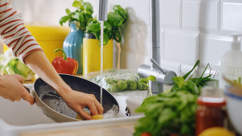 While it may seem contrary to popular wisdom, washing a greasy pan in hot water can actually do more harm than good. The issue lies in what it can do to your plumbing — the grease, melted by hot water, can actually solidify in your pipes, causing long-term issues when it coats them. As that gunk builds up, blockages can occur, which often require a professional plumber to address. It's also hard on more than just your plumbing, as accumulated grease and fats can negatively affect city sewers and wastewater treatment plants.
