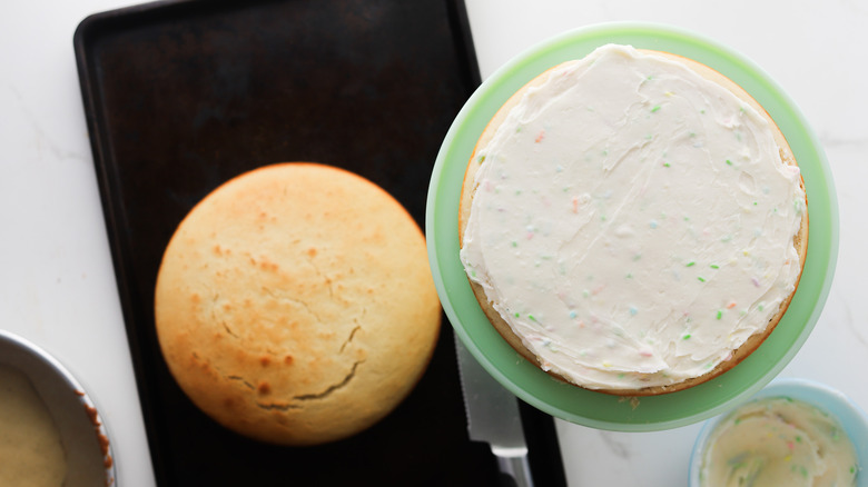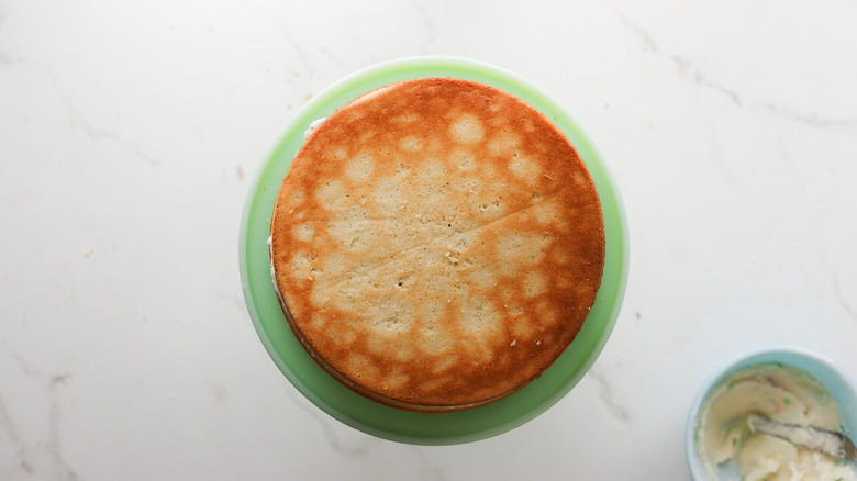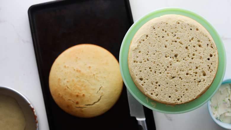 - Cut off the domed top of each cake to create a flat surface.