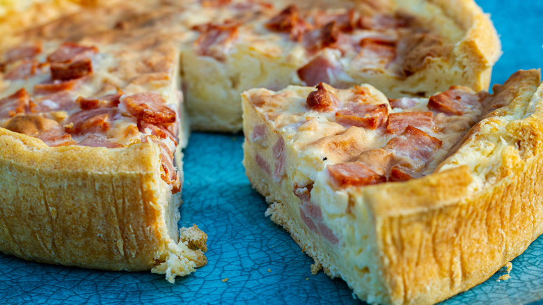 It's understandable that Hitchcock formed such a predilection for quiche Lorraine. To make a classic, straightforward quiche Lorraine, you need a pie crust, a mix of eggs, heavy cream, and milk, chopped bacon, and salt, pepper, and nutmeg for seasoning. Other go-to recipes for effortless quiche Lorraine include directions for adding cheese, too, and you can also work in any variety of veggies. Knowing how many eggs to use to make a perfect quiche is all about the egg-to-cream ratio, which is one egg per ½ cup. The result is a flaky, airy, slightly crisped crust with a creamy, buttery, fluffy filling bursting with salty, savory bacon.