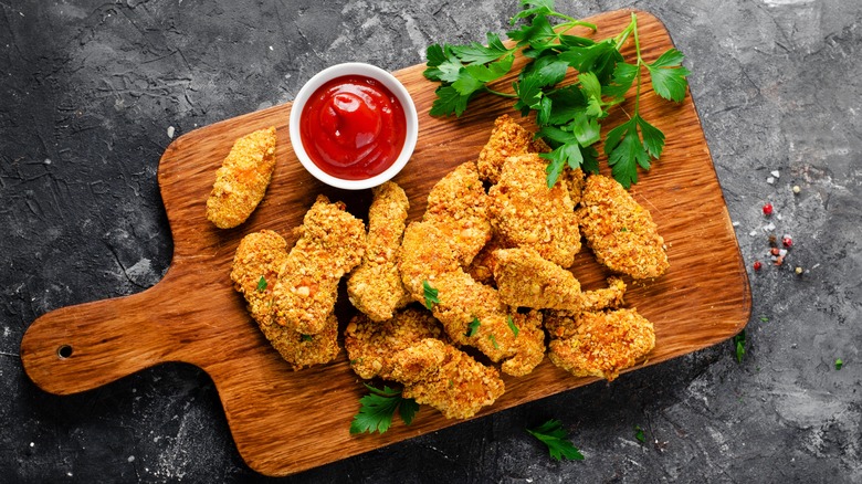 While chicken tenders served at restaurants are often deep fried, De Laurentiis demonstrates that baking them is easier to execute and to clean up. The chef simply drizzles her coated chicken tenders with olive oil before baking them in the oven. This brings an earthy richness and just the right amount of fat to give them that fried taste and golden color. Plus, because they're small, thinner cuts of chicken, chicken tenders don't take long to crisp up in the oven. While frying them will take around eight minutes, chicken tenders baked at 425 degrees Fahrenheit will take around 15 minutes. Air-frying is another easy option, and the cooking temperature and time in an air fryer is 400 degrees Fahrenheit for between eight and ten minutes.