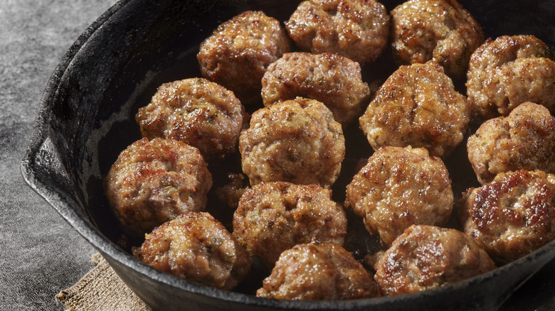 And of course, when putting a twist on classics like meatloaf, it would be a shame to limit yourself to tried-and-true recipe formats. Experiment with sautéing different finely-chopped veggies, like onions, peppers, carrots, or even leeks, to add to your meatloaf batter. Or mix in shredded cheese for an umami accent. Then, while you're making the dish into bite-sized pieces, before baking them in the oven, try topping each individual meatloaf ball with a sauce made with hot honey barbecue sauce, or even teriyaki sauce for an Asian-inspired twist. Or set cranberry sauce or ketchup on the side of your appetizer tray to make for some interactive dipping fun. And finally, you can definitely get creative with the meat you include. For instance, try out combinations of beef and pork, or make your meatball appetizer with lamb. If you're serving plant-based guests, use ground meat alternatives.