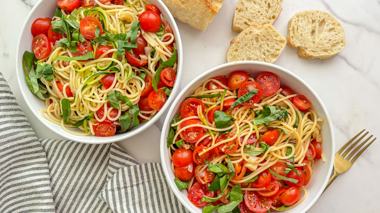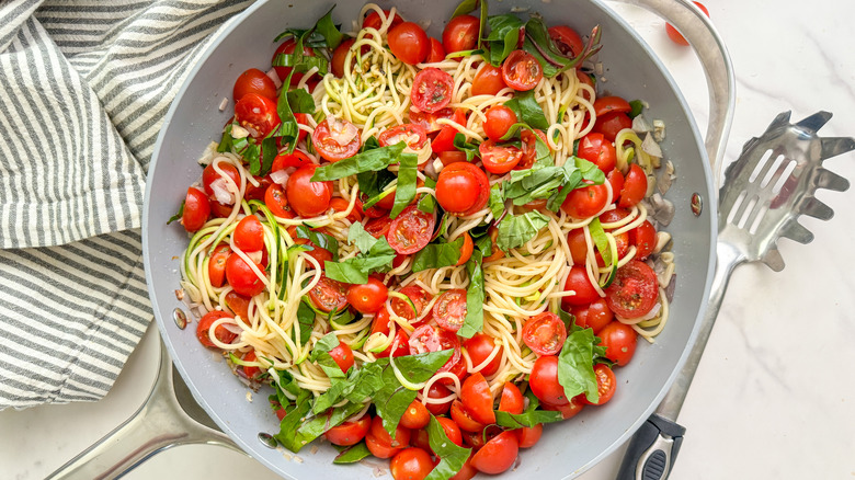"I love using zucchini noodles but sometimes they can come out watery," wellness coach and recipe developer Miriam Hahn says. "The cooked spaghetti here absorbs any extra moisture and balances out the textures in a delicious way. Plus, it is visually a beautiful dish." As a final plus, this recipe also makes for a great way to use up fresh vegetables from your garden — though fresh veggies from the supermarket will work just fine.