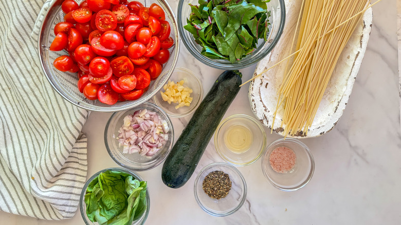 Gather the ingredients for spaghetti and zucchini noodle garden pasta
