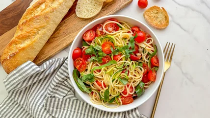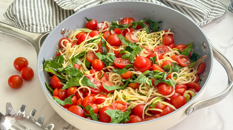 Put your garden harvest to good use with this bountiful spaghetti, zucchini noodle, and cherry tomato dish.