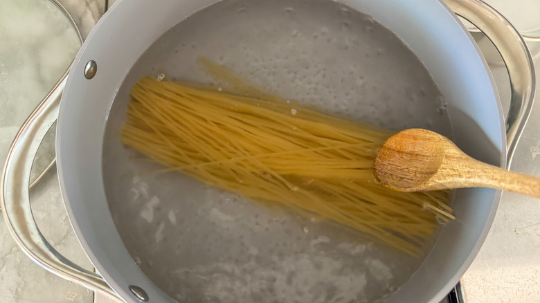 Add the spaghetti to the pot of boiling water and cook per package instructions.