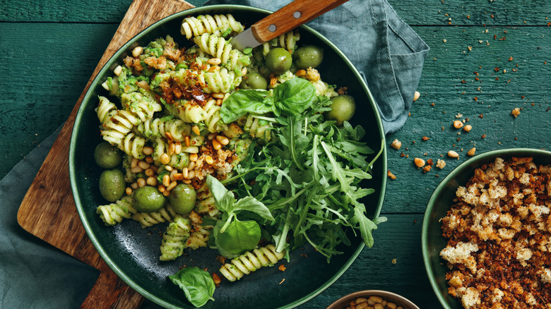 Instead, whip out a few common ingredients to transform your leftover pesto into a simple salad dressing, so you can chow down on meals with this condiment for both lunch and dinner. All you need are oil and vinegar. Add these two into the jar with your leftover pesto, shake vigorously, and you have a quick, makeshift salad dressing. A classic recipe for the original condiment includes basil, garlic, pine nuts, lemon zest and juice, olive oil, and salt, so you already have plenty of herby, zesty goodness in the pesto — the oil and vinegar will just thin out the texture so it's easy to toss into a salad and add a little more tang so it feels more like a vinaigrette.
