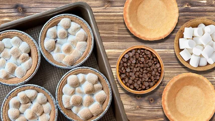 As for the chocolate, use mini chips so they melt faster, or break up a candy bar like you'd do for a classic s'mores. And you obviously cannot forget about the marshmallows. We recommend using mini ones so they fit into the small pie crusts more easily or go with a few large ones if that's what you already have in the pantry.