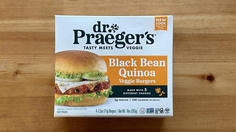 There's a reason why black bean burgers are some of the most common types of veggie burgers you'll see in the wild. Dr. Praeger's black bean quinoa veggie burgers are a testament to how wonderful black beans can be when they're added to a veggie burger. Red bell peppers, corn, and brown rice make up the bulk of the patty, while ingredients like jalapeños and garlic give it its signature flavor. The patty is slightly spicy, but it's not hot enough to overwhelm your palate. The patty also crisps up and stays intact better than most of the other burgers on this list.