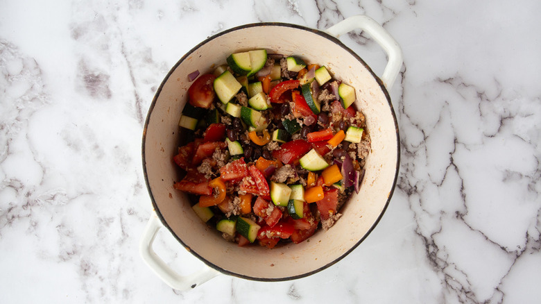 - Add the diced tomatoes, black beans, and diced summer squash. Season with salt and pepper, to taste.