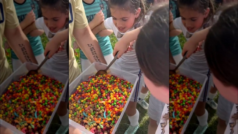Most candy salad videos on TikTok are done by groups of people rather than solo. Sports teams and school clubs are common examples, but candy salads certainly aren't limited to this group. This trend would go over well at weddings, birthdays, bachelorette or bachelor parties, or even just a random Friday night in with friends.