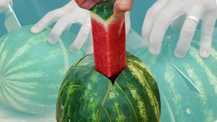 To do it, first halve your watermelon perpendicularly. Second, make a series of vertical cuts through the skin. And third, slice it in the opposite direction to make a crisscross pattern. While some people opt to cut their watermelon into wedges before removing the peel and slicing the flesh into chunks, others prefer to keep the skin on and slice them into cute little triangles. The benefit of this latter method is that the peel acts as a handle; you can simply grab a slice from the fridge and toss away the peel once you're done eating.