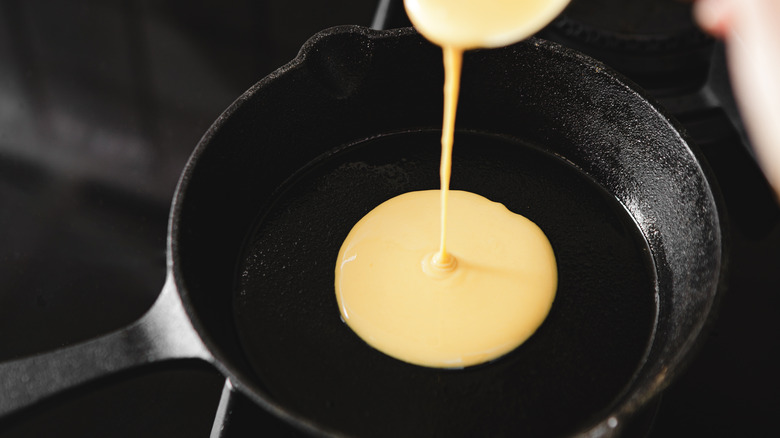 Additionally, avoid letting your skillet get too hot. High heat will cause the outside of your pancake to start burning before the middle even gets a chance to warm up. For proper preheating, set your stove to medium heat, place your well-seasoned cast iron skillet on top, and leave it for three to five minutes. Next, check if it's sufficiently hot using either the water-sprinkle method or an infrared thermometer. Once it's ready, turn down the heat to medium-low before pouring in your batter.