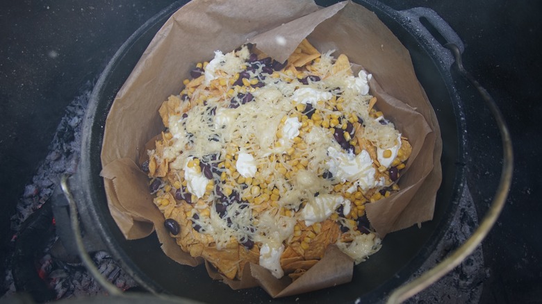 Once cooked, you can serve the pan of cheesy, seasoned nachos with warmed tortillas, extra chips, salsa, and guacamole. Season your protein choices before leaving the house so you don't need to tote spice jars to your campsite and make a container of fire-roasted salsa or charred tomato salsa in advance so you have minimal prep work once hunger pangs strike. While you can bring blocks of cheese to shred onsite, you can also take shredded cheese with you to make layering easy.