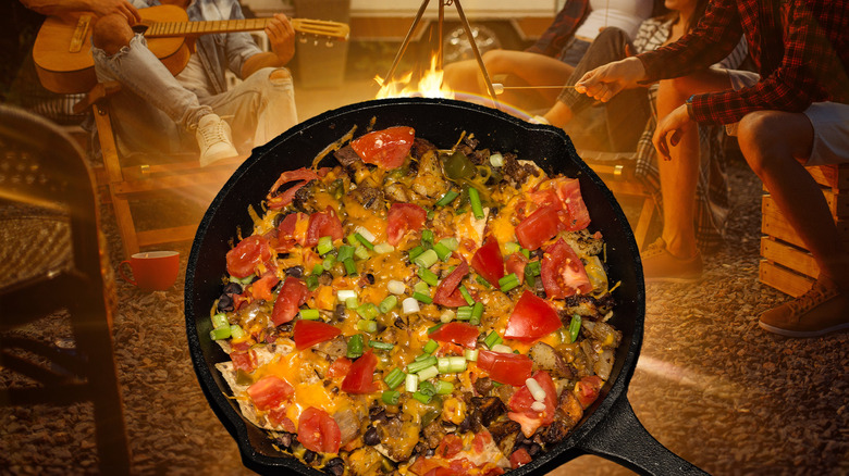 Should you have many mouths to feed on your next camping trip or are simply craving a satisfying meal that requires little fuss once you've arrived at your campsite, consider adding nachos to your al fresco menu. Making nachos on a camping trip is a simple recipe that can be made quickly in a cast iron pan. Similar to the easy-baked nachos you make at home, pack layers of chips, cheese, beans, vegetables, and meat into a skillet, cover with a lid and let the tasty assembly of your favorite ingredients heat to gooey deliciousness over hot coals.