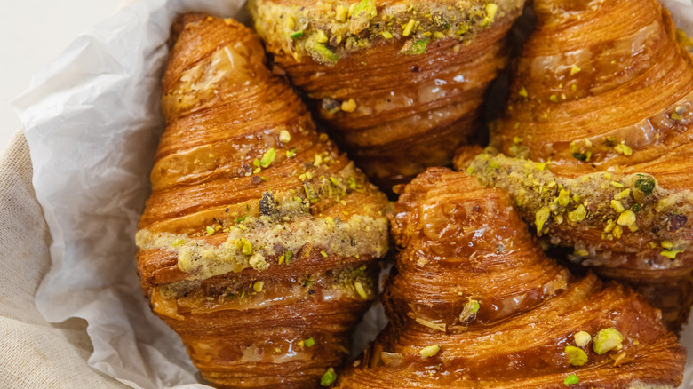Should you have a package of pistachios at the ready, pulse the nuts with sugar and vanilla extract to make a pistachio mixture that can be used to fill the croissants. If you don't have nuts tucked away in your cupboards, you can use pistachio extract and combine it with sugar, eggs, butter, and almond flour. Slice each croissant in half lengthwise, cover the exposed sides with a smear of butter, then layer a generous coating of the nutty spread onto the surface. The filled croissants will be baked to perfection in the oven.