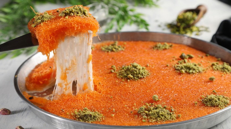 Middle Eastern cuisine boasts an impressive array of desserts. Whether it's the several dozen variations of baklava or the widespread simple honey cake, this part of the world makes sweet treats shine. Another iconic — and seriously delicious — sweet dish popular across the region is knafeh.