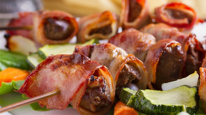 Rumaki, which has been around since the 1940s, is another liver and bacon recipe that's still a crowd-pleasing appetizer. The bacon-wrapped bits of chicken liver and water chestnuts are marinated in soy sauce and brown sugar, then secured on skewers or toothpicks and baked. Even folks who proclaim to not like liver will usually end up gobbling down a few. Bacon is also a fine enhancer for chicken liver pâté. Just add it to the food processor with the other ingredients (plus some of the grease) for a richer texture and taste. And don't neglect to add bacon to your liver sandwiches. Chopped liver is a common product at Jewish delis, but you won't find pork there. If you're not on a kosher diet, purchase chopped liver and try some with bacon on your homemade sandwiches.