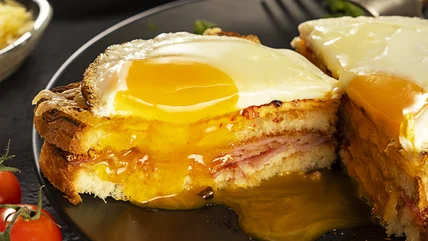 French cuisine is well-known for its utterly rich sweet-and-savory recipes, making good use of a longstanding mastery of all things dairy. The iconic croque madame sandwich (which Dale Levitsky put his own spin on) is a heavenly display of French decadence consisting of butter, cream, and cheese in luxurious proportions. The process of making a croque madame is essentially stacking open-faced sandwiches and finishing with a fried egg. Sturdy slices of crusty white bread are layered with ham, a cheesy bechamel called mornay sauce, and more cheese, stacked, and finished with another layer of gooey bechamel and a fried egg. If this doesn't sound decadent enough, croissants are the store-bought bread swap to provide the ultimate upgrade.