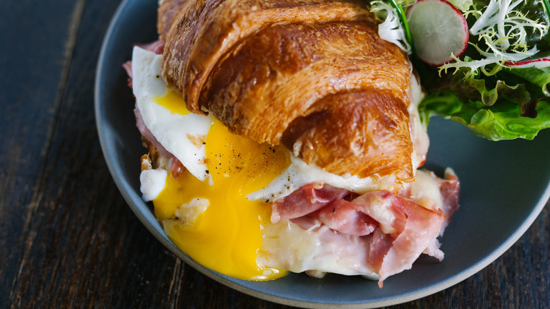 Croissants will be the buttery, rich foundation that'll only heighten the savory, gooey goodness of the croque madame's other ingredients. Plus, croissants are some of the most famous French pastries, so you won't lose any authenticity. Of course, a flakey, delicate croissant won't hold up under the weight of a cheesy cream sauce, ham, and a fried egg, so you'll make an easy modification by flattening and searing it in the skillet you would've used to grill the crusty bread.