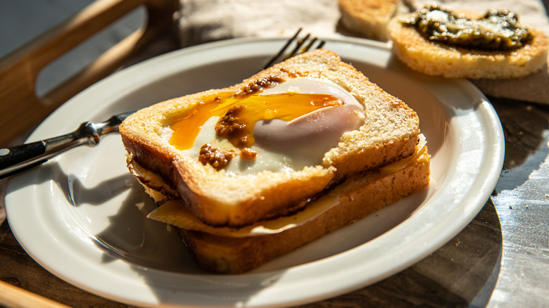 However, egg-in-a-hole grilled cheese can also be easily riffed on, far more than just which cheese you use. We suggest starting with melty Oaxacan cheese and topping the egg-in-a-hole with beans or pico de gallo and sliced avocado for a Mexican variation. Or try filling it with ham or bacon which will turn the dish into a full breakfast in one neat little package. And if you're looking for something a little more complex, add sliced jalapeños for a fiery kick, caramelized onions for a little sweetness, or spread some fresh pesto on the toast after cooking for a nice herbal addition.