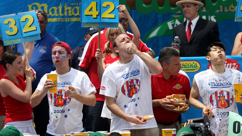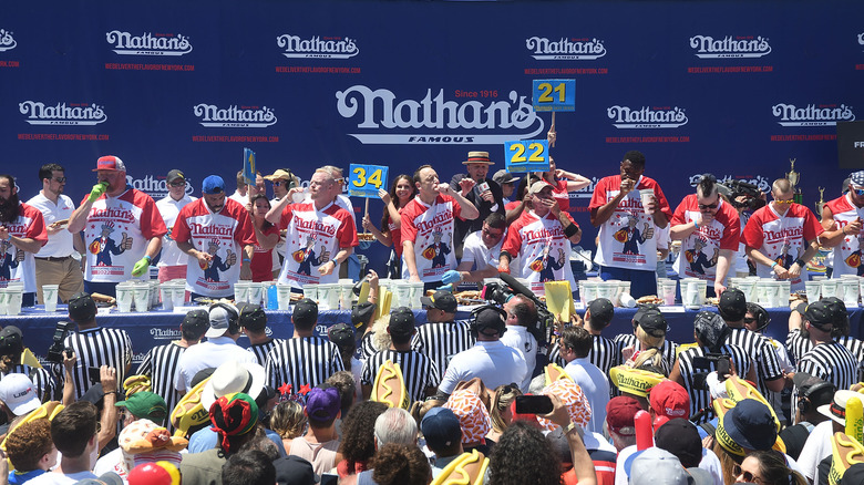 Since then, per Nathan's Famous, about 40,000 fans from around the globe gather to watch the contest live every year, and the contest's rules have not changed. For starters, contestants must be 18 or older to compete. They have 10 minutes to eat as many hot dogs and buns as they can, by hand and sans utensils. If anyone vomits, they are immediately disqualified. Condiments are not allowed, and contestants may drink anything non-alcoholic during the contest. You're allowed to dip your buns into water to help them go down more easily The winner is the contestant who eats the most hot dogs and buns within 10 minutes.