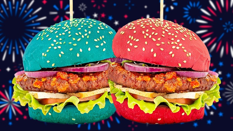 As the 4th of July creeps closer, it's time to start planning out all of the kitschy ways we can represent our annual showcase of patriotism. From napkins adorned with stars and stripes to the quintessential mixed berry pie with whipped cream — red, white, blue is on full display — except when it comes to the main courses. Hot dogs and burgers are often left out, but with a little bit of food dye, you can easily fix that.