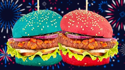 Aside from the vibrant red and blue buns, there are tons of other ways your burgers can represent the holiday spirit. For a crowd-pleasing burger, whip one up with plenty of blue cheese, minced white onions, and tomatoes or roasted red peppers. The trio brings a combination of tangy, pungent flavors that work especially well with both beef and the earthy, mild sweetness of beetroot powder, one of the best red food coloring substitutes you can use for hamburger buns.
