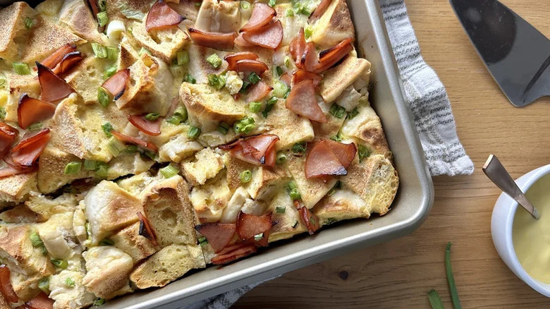 If you prefer a breakfast or brunch option rather than a sandwich, consider making a casserole with leftover hot dog buns. An overnight eggs Benedict casserole has hearty inclusions, such as Canadian bacon and eggs. But you could use sausage as your preferred brunch meat or add shredded cheese, spinach, or diced mushrooms. Rather than English muffins, you will substitute the last of your hot dog buns, such as white or potato, to act as a neutral base for this savory dish.