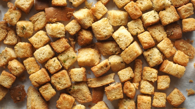 Croutons are one of the simpler creative ways to use leftover hot dog buns. They are usually made by baking or pan-frying pieces of bread, so you can apply the same technique with buns. You only need a few ingredients to make croutons at home, including hot dog buns and fat, such as butter or olive oil. A basic white hot dog bun works best since it acts as an unadorned base to load flavor onto, whether you add salt, pepper, thyme, garlic, or something else.